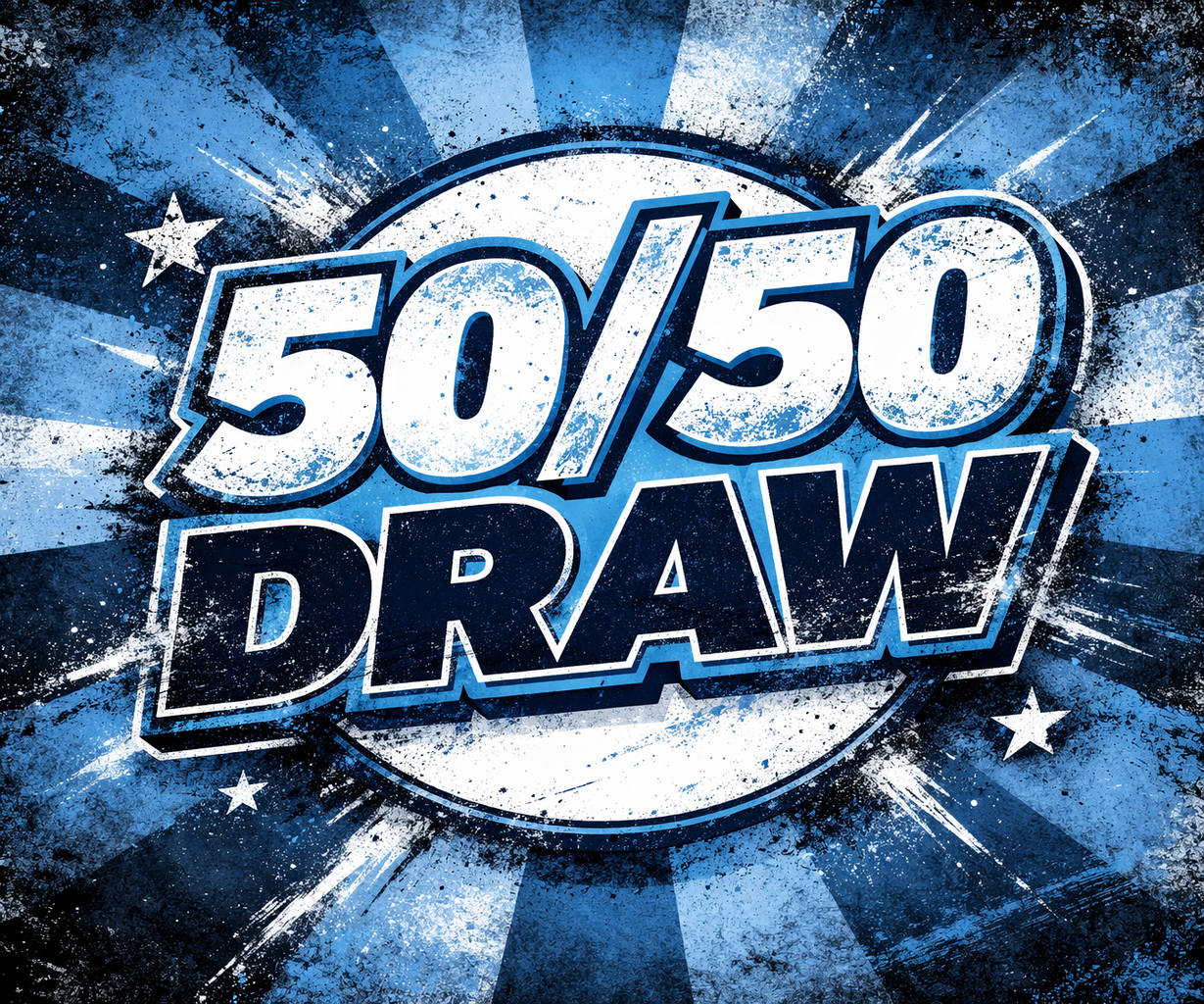 50/50 RAFFLE: CASH ONLY! $10 for one green ticket, 3 tickets for $25, 10 tickets for $50, winner takes half of 50/50 sales.